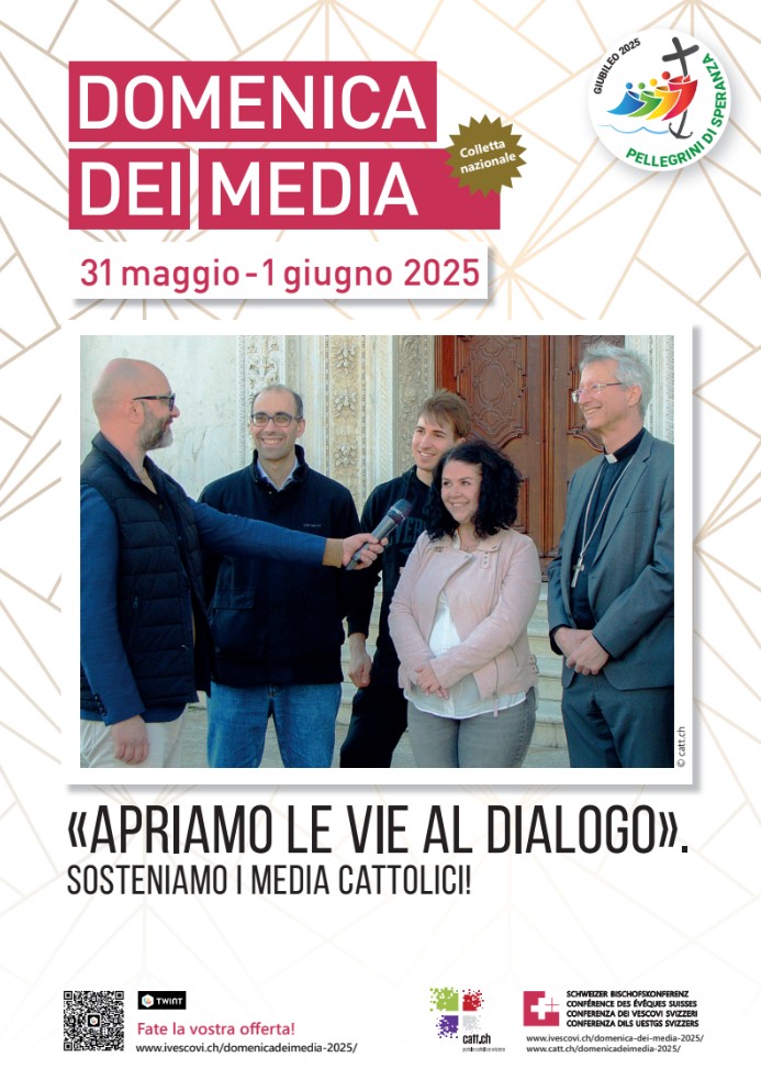 La colletta nazionale della domenica dei media avrà luogo il 31 maggio e il 1. giugno 2025. La colletta che è destinata al lavoro dei media della Chiesa cattolica in Svizzera va a beneficio soprattutto dei Centri media di Losanna, Lugano e Zurigo. Quindi con la colletta si sostiene anche il lavoro di Strada Regina, Chiese in diretta, catt.ch e catholica. Questi centri forniscono al pubblico cattolico e non cattolico informazioni sulla vita della Chiesa e delle comunità religiose in Svizzera, in Ticino, in Vaticano e nel mondo. Il lavoro è svolto da giornalisti professionisti.