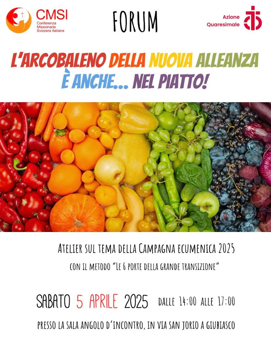 Forum CMSI in collaborazione con Daria Lepori di Azione Quaresimale, che si terrà sabato 5 aprile 2025 dalle 14:00 alle 17:00 presso la Sala Parrocchiale "Angolo d'incontro" in Via San Jorio a Giubiasco.