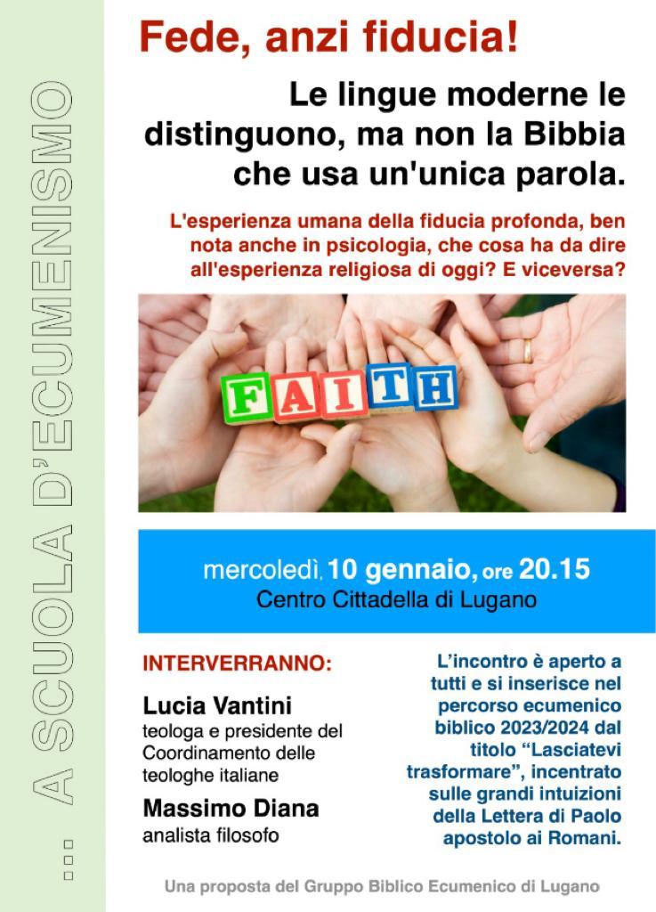 Se ne parlerà mercoledì 10 gennaio nel contesto degli incontri biblici ecumenici delle parrocchie di Lugano (evangelici, battisti, cattolici), per il tradizionale evento speciale di inizio anno “A scuola di ecumenismo”. Ospiti: la teologa Lucia Vantini (presidente del Coordinamento delle teologhe italiane) e l’analista filosofo Massimo Diana. Appuntamento al Centro Cittadella di Lugano (Corso Elvezia 35), ore 20.15, di mercoledì 10 gennaio 2024.