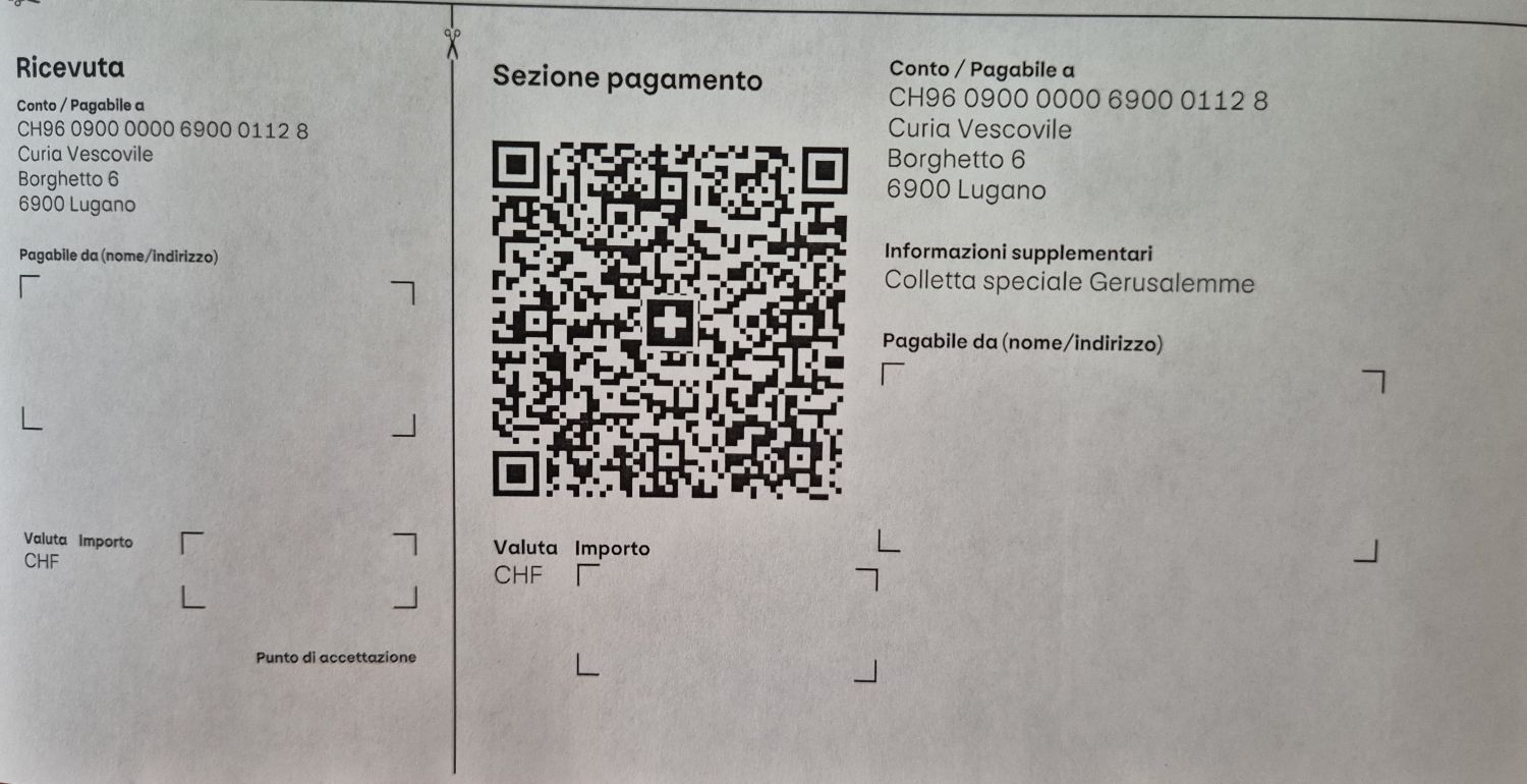 Sul sito della Curia diocesana è possibile trovare in formato PDF la cedola con QR per sostenere la Terra Santa (vedi anche sotto). E’ possibile anche chiedere alla Curia una copia cartacea: curialugano@catt.ch