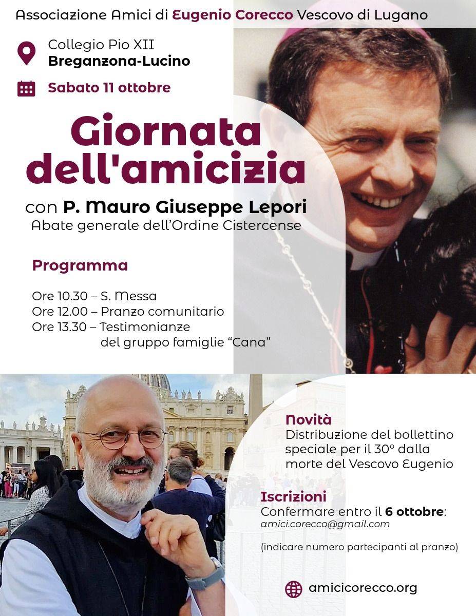 Dopo le belle esperienze degli anni passati, iniziate nel 2004, l’Associazione Amici di Eugenio Corecco è lieta di invitare tutti alla giornata di convivenza e amicizia che si terrà sabato 11 ottobre 2025 presso il Collegio Pio XII di Breganzona-Lucino.