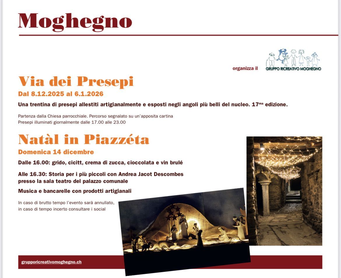 È stata anche la «Via dei presepi» di Moghegno ad ispirare il raccontastorie Andrea Jacot-Descombes, che ha scritto e messo in scena un racconto dedicato al presepe. Sarà presentato per la prima volta oggi, nell’ambito dell’evento «Natàl in Piazzéta», organizzato a partire dalle 16 a Moghegno, in Vallemaggia, e che inaugurerà l’edizione di quest’anno della «Via dei presepi».
