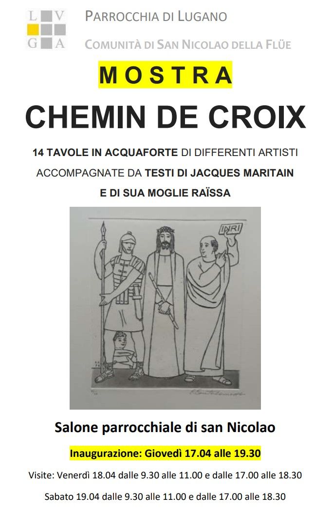 La comunità di San Nicolao della Flüe della parrocchia di Lugano, ospita in occasione della Settimana Santa una mostra dal titolo "Chemin de Croix". L'inaugurazione avverrà giovedì 17 aprile alle ore 19.30, dopo la celebrazione della Messa della Cena del Signore, presso il salone parrocchiale di San Nicolao. Esposte al pubblico ci saranno 14 tavole originali in acquaforte, numerate e firmate, realizzate da rinomati artisti contemporanei. Le opere sono accompagnate da commenti spirituali e poetici scritti dai coniugi Jacques e Raïssa Maritain.