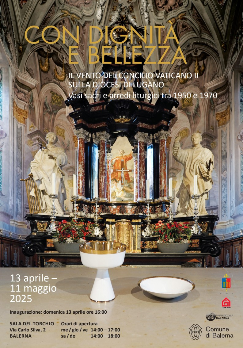 Dal 13 aprile all'11 maggio 2025, nella Sala del Torchio di Balerna, sarà possibile visitare la mostra "Con dignità e bellezza", curata da don Angelo Crivelli. L’iniziativa ricorda i sessant’anni del Concilio Vaticano II attraverso gli oggetti liturgici realizzati tra il 1950 e il 1970, testimoniando il rinnovamento vissuto dalla Diocesi di Lugano. L'inaugurazione avverrà domenica 13 aprile alle ore 16.00.