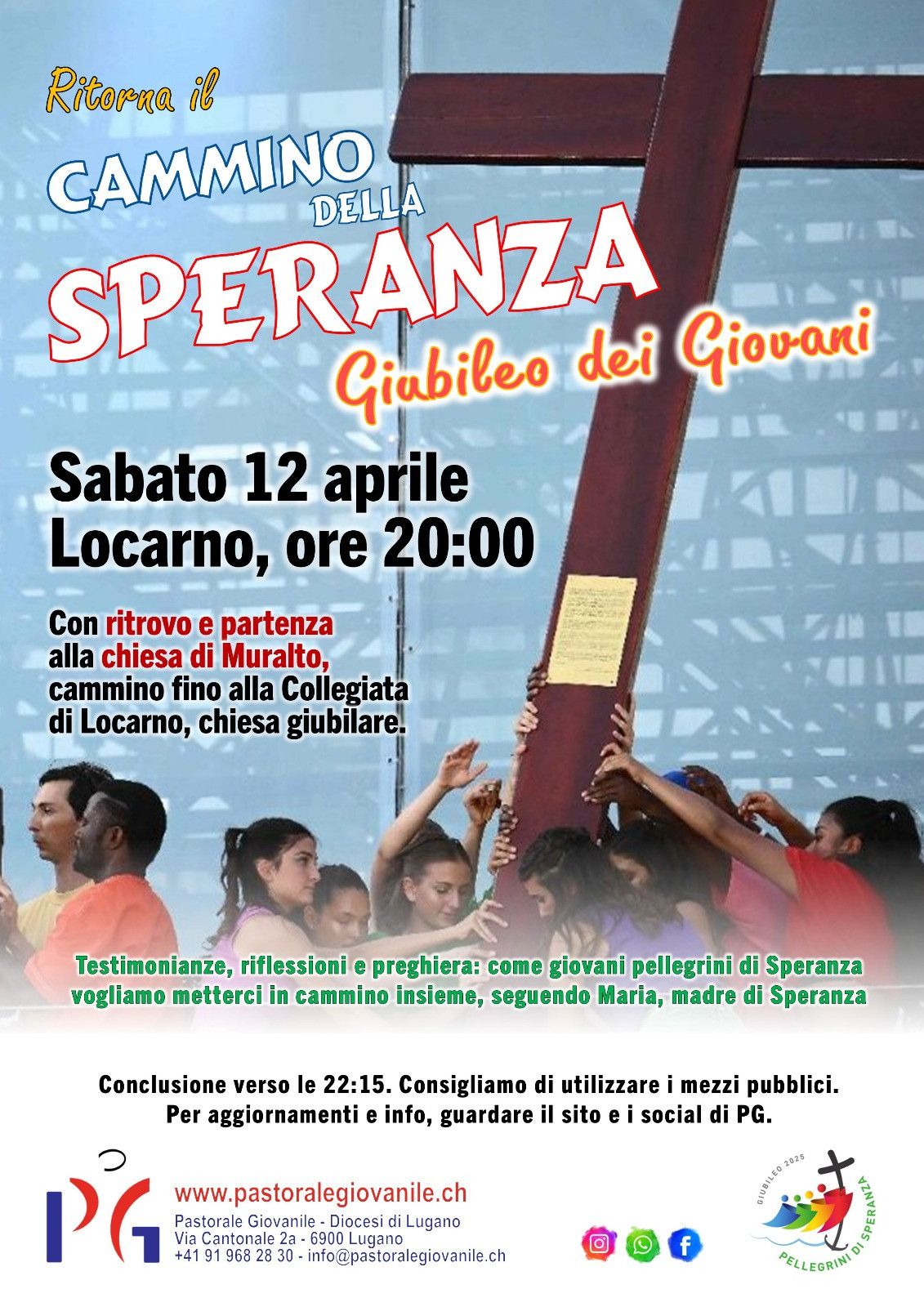Sabato 12 aprile 2025, a Locarno, si terrà il Cammino della Speranza, occasione di festeggiare assieme anche il Giubileo dei Giovani diocesano, pensato per i ragazzi dalla terza/quarta media, i giovanissimi e giovani. Un momento semplice ma intenso, che unisce cammino, ascolto e fede. Per chi lo desidera il ritrovo è alle 19.00 per una cena al sacco assieme, poi alle 20.00 la partenza da Muralto.