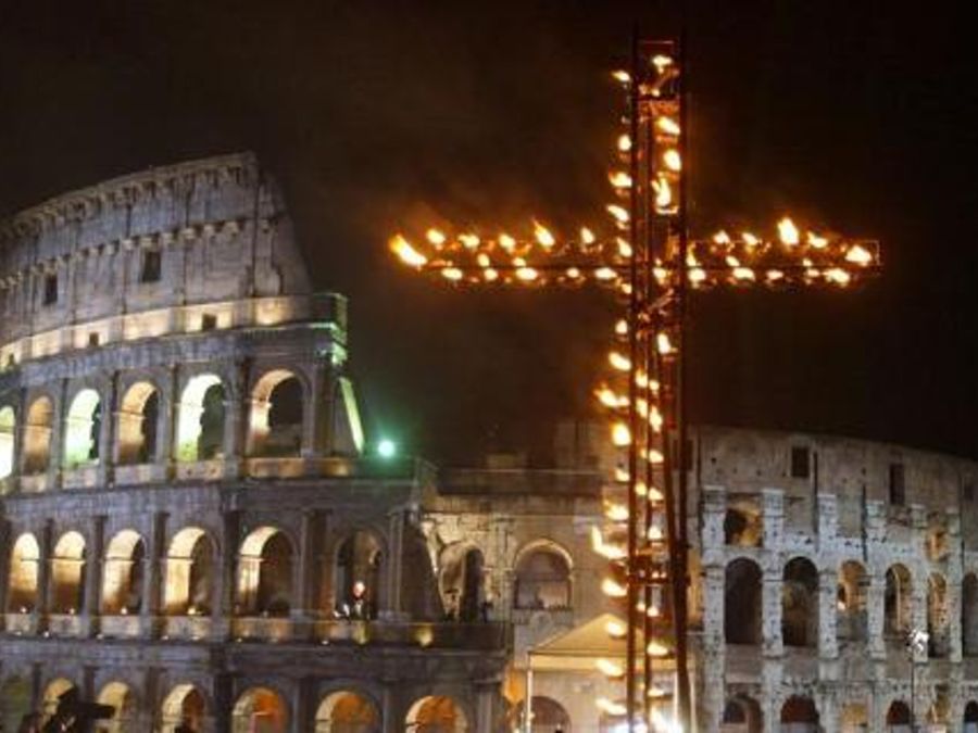 Alle spalle del Papa le fiaccole illuminano l’enorme crocifisso allestito, come tradizione, sopra la collinetta dinanzi alla Basilica di Massenzio, al fianco della Via Sacra che attraversa tutto il Foro Romano fino al Campidoglio.10'000 in tutto, si calcola, i partecipanti.