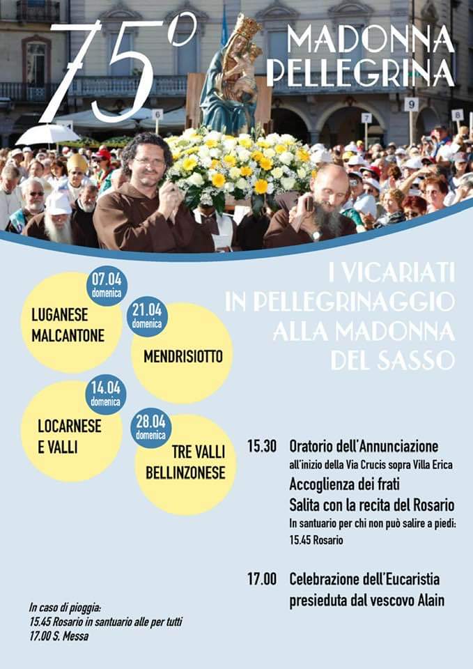 Nelle domeniche di aprile, i vicariati della diocesi si recheranno in pellegrinaggio alla Madonna del Sasso per celebrare il 75° anniversario della Madonna pellegrina. Ecco il calendario: 7 aprile, vicariato del Luganese e Malcantone; 14 aprile, Locarnese e valli; 21 aprile, Mendrisiotto; 28 aprile, Tre Valli Bellinzonese. Ritrovo alle 15.30 all’oratorio dell’Annunciazione, salita con la Recita del Rosario, ore 17 celebrazione dell’Eucarestia presieduta dal vescovo de Raemy. In caso di pioggia, si svolgerà tutto in chiesa a partire dalle ore 15.45.