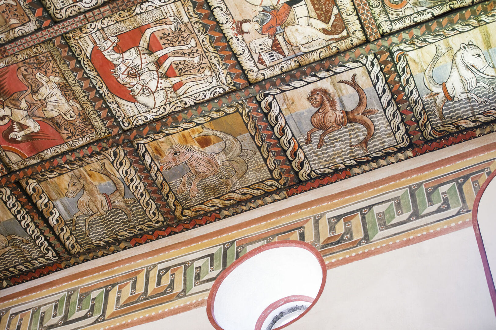 Un ignoto e ingegnoso teologo del XII secolo, su incarico del vescovo di Coira Wido (1095-1122, ai tempi di Papa Pasquale II e dell’imperatore Enrico V ), concepì e fece dipingere su tavole di legno di abete e larice le vicende del Nuovo Testamento attorniate da tante raffigurazioni mostruose profane. Queste figure pagane avrebbero favorito la pastorale ecclesiastica cristiana nella popolazione, allora contadina e analfabeta, dell’alto corso del Reno tra Coira e il passo del San Bernardino, verso il Ticino e verso Roma. I dipinti furono poi appesi sul soffitto della chiesa di Zillis, quindi con l’esplicito invito a guardare in su, in segno concreto di trascendenza. La chiesa di Zillis è un’opera d’arte grandiosa e non a torto è conosciuta come “la Cappella Sistina delle Alpi”, ma questa mostra vuole approfondirne piuttosto il suo significato spirituale. Guardando in su questi piccoli quadri sacri appesi sul soffitto, la vita di Gesù Cristo viene circondata da tante figure mostruose e pagane (spesso per metà un vivente terrestre e per l’altra metà un pesce dall’imponente coda). Viene quindi spontanea l’idea, che il teologo medioevale abbia voluto centrare il discorso della doppia natura di Gesù Cristo secondo il concilio di Calcedonia dell’anno 451 d.C. Ma ogni visitatore di questa magnifica opera d’arte sacra può e deve dapprima cercare di immergersi nello spirito medioevale e contadino del XII secolo d.C. e poi cercare di raffinare la propria visione del divino e soprattutto quella di Gesù Cristo. Dal punto prettamente teologico cristiano è interessante notare come in questa raffigurazione del Vangelo popolare del XII sec. vengano trascurate la morte e la risurrezione di Gesù Cristo, per esaltare maggiormente la complessità della Sua vita terrena.