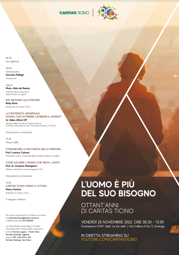 Ricordiamo che per sottolineare l'anniversario degli 80 anni Caritas Ticino propone venerdì 25 novembre 2022 dalle ore 8.30 fino alle ore 13.00 presso la sala Le tre vele della Fondazione OTAF a Sorengo il Convegno dal titolo “L'uomo è più del suo bisogno” come da programma allegato, in diretta streaming su youtube