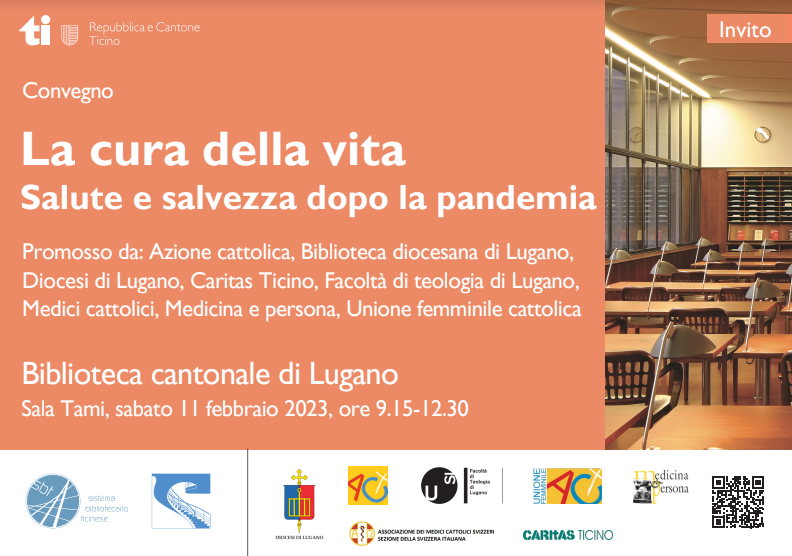 Promosso da: Azione cattolica, Biblioteca diocesana, Diocesi di Lugano, Caritas Ticino, Facoltà di teologia, Medici cattolici, Medicina e persona, Unione femminile cattolica.