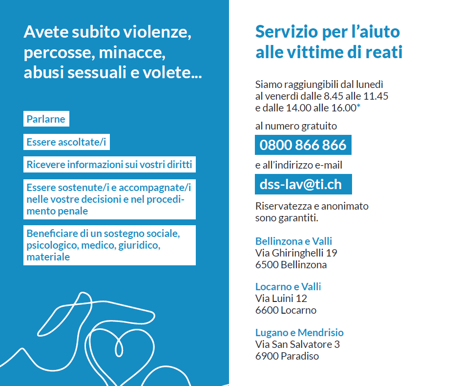 Numero di contatto del Servizio per l'aiuto alle vittime di reati (Servizio LAV) del Canton Ticino: 0800 866 866