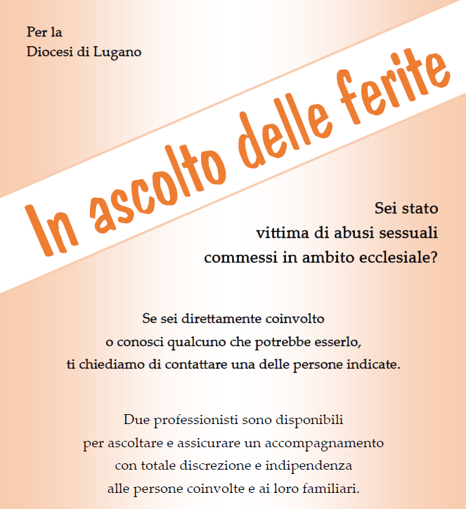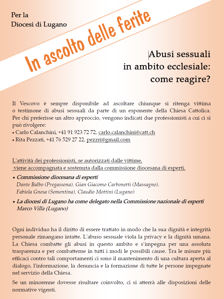 Numeri di contatto della commissione di esperti della diocesi di Lugano: Carlo Calanchini, +41 91 923 72 72, carlo.calanchini@catt.ch; Rita Pezzati, +41 76 529 27 22, pezzri@gmail.com