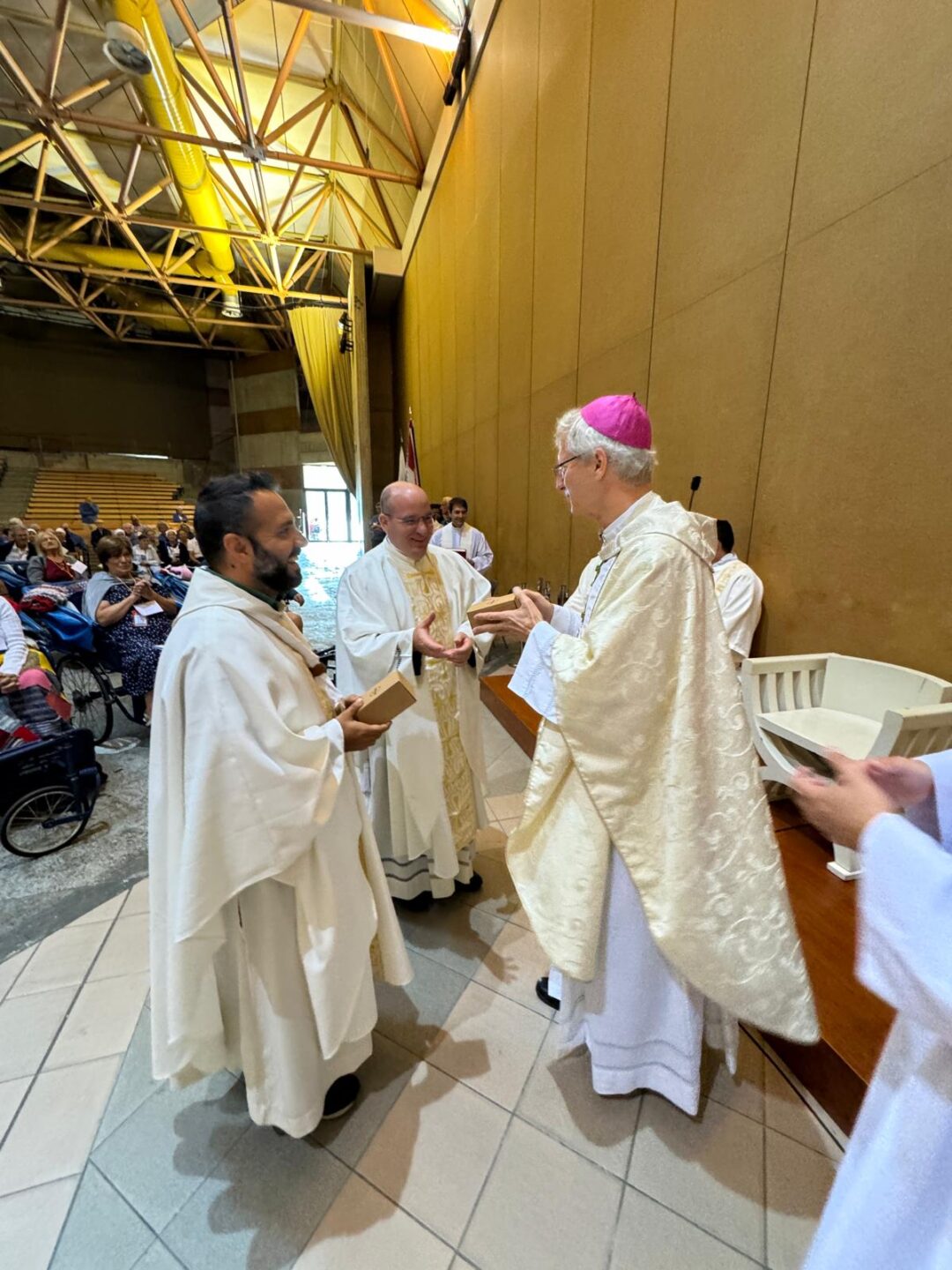Il vescovo de Raemy ha inoltre presentato i presbiteri presenti al pellegrinaggio: Mons. Nicola Zanini, Delegato ad Omnia della Diocesi di Lugano, Mons. Claudio Mottini, Arciprete della Cattedrale di Lugano e Rettore del Seminario San Carlo, Don Massimo Braguglia, Prevosto di Agno e Direttore dell’Opera Diocesana Pellegrinaggi, Don Guido Pagnamenta, Arciprete di Morbio Inferiore, Don Davide Droghini, Parroco di Cadro e Davesco-Soragno, Don Stefano Bisogni, Vicario parrocchiale di Mendrisio, Don Giuseppe Albisetti, residente a Morbio Inferiore, Don Pietro Borelli, residente nella casa per sacerdoti San Filippo Neri a Sonvico, Don Tomasz Tomczyk, Parroco di Canobbio, Don Nathan Fedier, Vicario parrocchiale di Locarno, Don Fabio Minini, Parroco di Rivera, Bironico, Don Giustino Petre, Parroco di Comano – Cureglia, Don Emanuele Di Marco, Cerimoniere Vescovile, Don Tiberio Iancu, studente presso la Pontificia Università Sant’Anselmo in Roma (della Diocesi di IASI Romania). HHa inoltre annunciato che Don Davide Santini, verrà ordinato presbitero il prossimo 7 settembre. Nello stesso giorno Hugo Mota Almeida sarà ordinato Diacono.