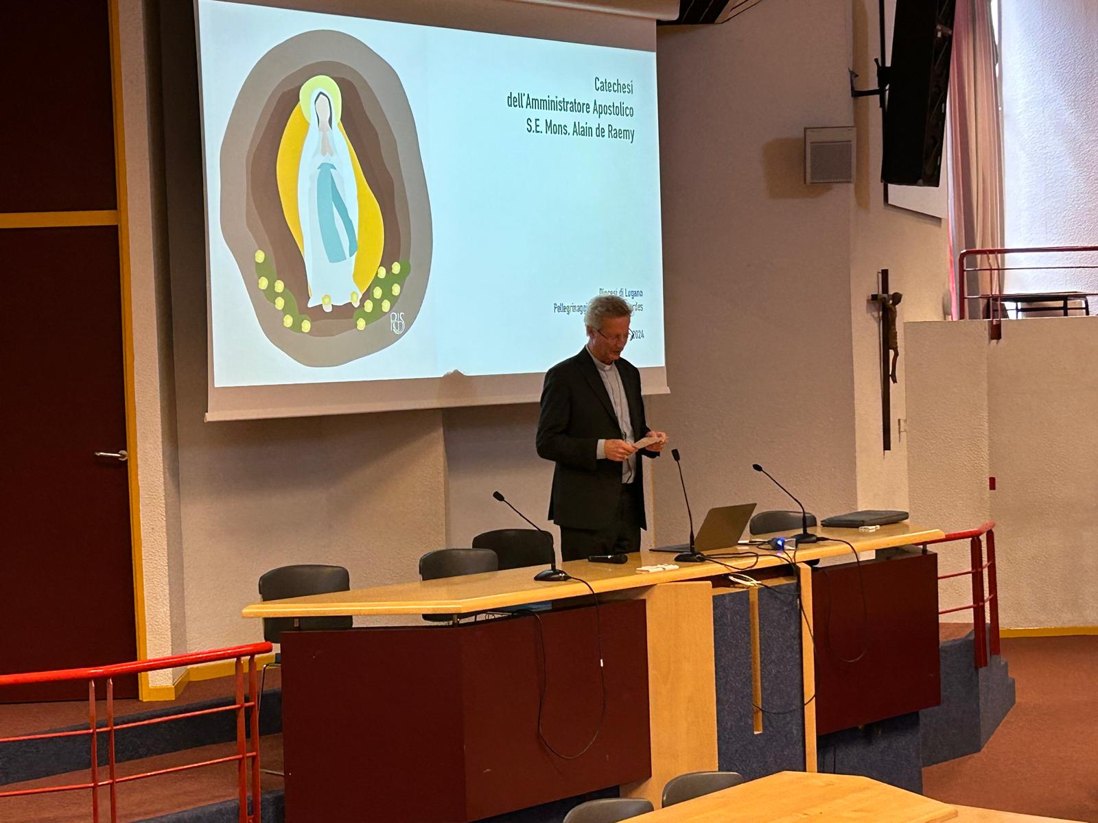 Il vescovo Alain nell'emiciclo ha parlato di Maria come porta di conversione alla fede cristiana per molte persone. Seppure in varia misura, molti si possono riconoscere nell'accettazione della sua maternità, nelle sue prove di madre, nel prendersi carico delle terribili agonie di suo figlio come fossero sue. Maria soffre i più grandi dolori che si potrebbero sopportare. Rivolgersi a lei nei momenti di prova significa trovare sicuro ascolto di un cuore di Madre capace di comprendere i dolori più profondi. Trovare comprensione non significa risolvere un dolore ma significa dargli un nuovo significato. Questo stesso significato è ciò in cui si trova la nostra redenzione e la nostra pace interiore".