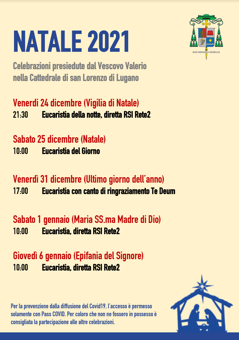 Questi gli orari delle celebrazioni del tempo di Natale presiedute dal Vescovo di Lugano, mons. Valerio Lazzeri. Per accedere alle celebrazioni - la Curia - ricorda che è necessario esibire un CovidPass valido. La cattedrale verrà aperto 45 minuti prima della celebrazione.